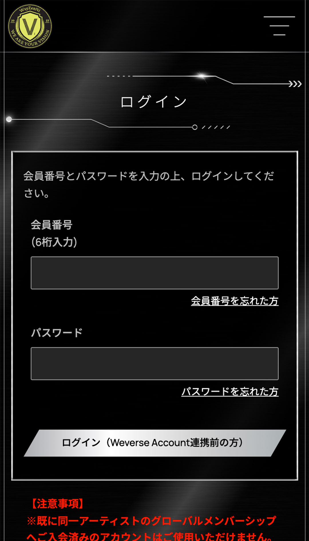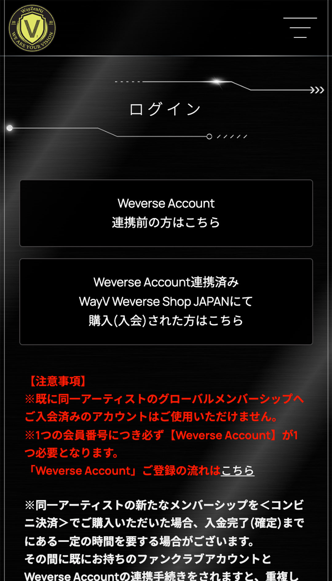 Weverse Accountをお持ちでない方は事前にご登録いただき(「Weverse Account」ご登録の流れ:https://wayzenni-japan.smtown-fc.jp/weverse_page/weverse_account)、下記の手順に従ってWeverse Accountと連携をお願いいたします。