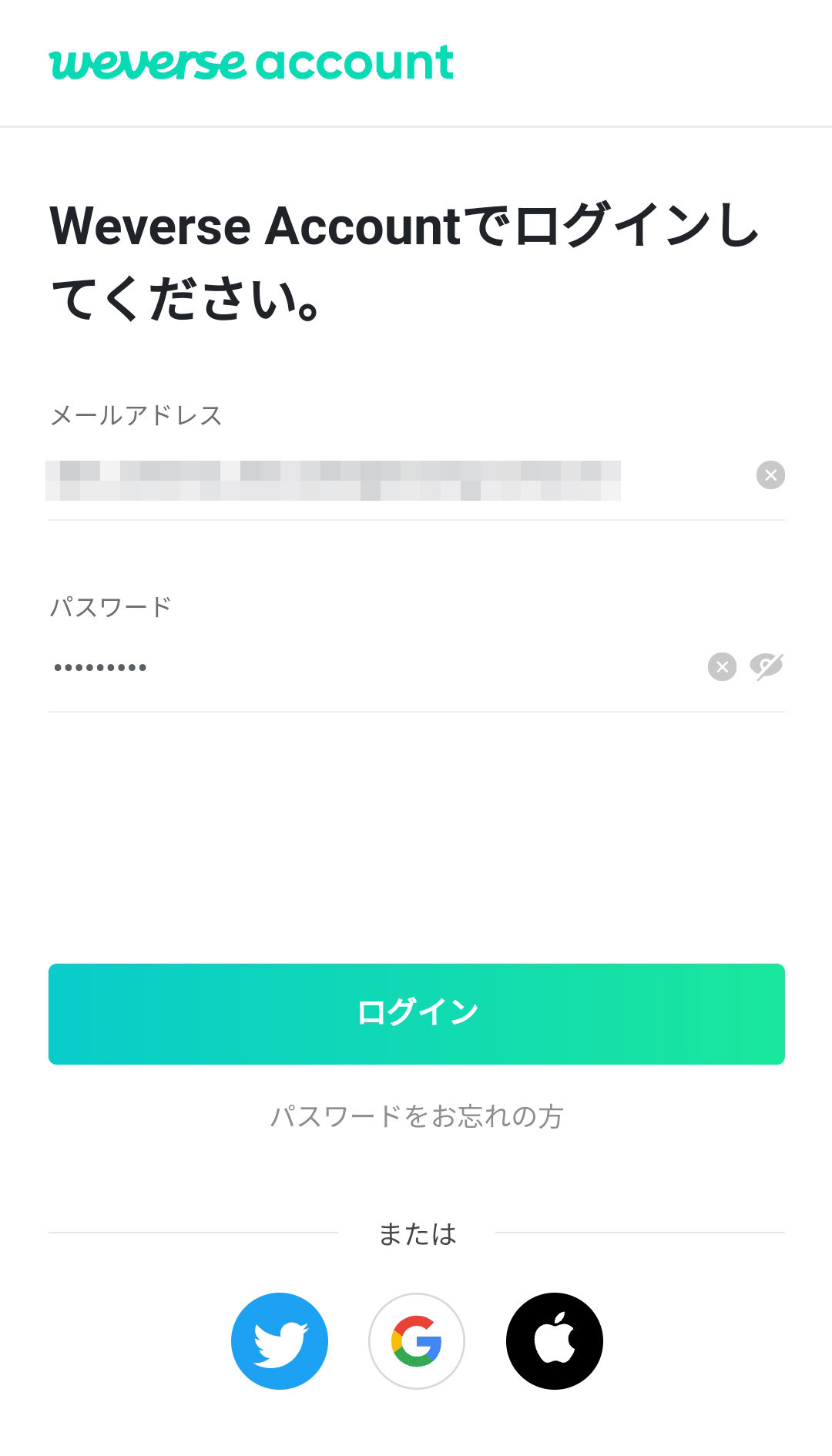 10.再度Weverse Accountメールアドレスとパスワードを入力後、ログイン