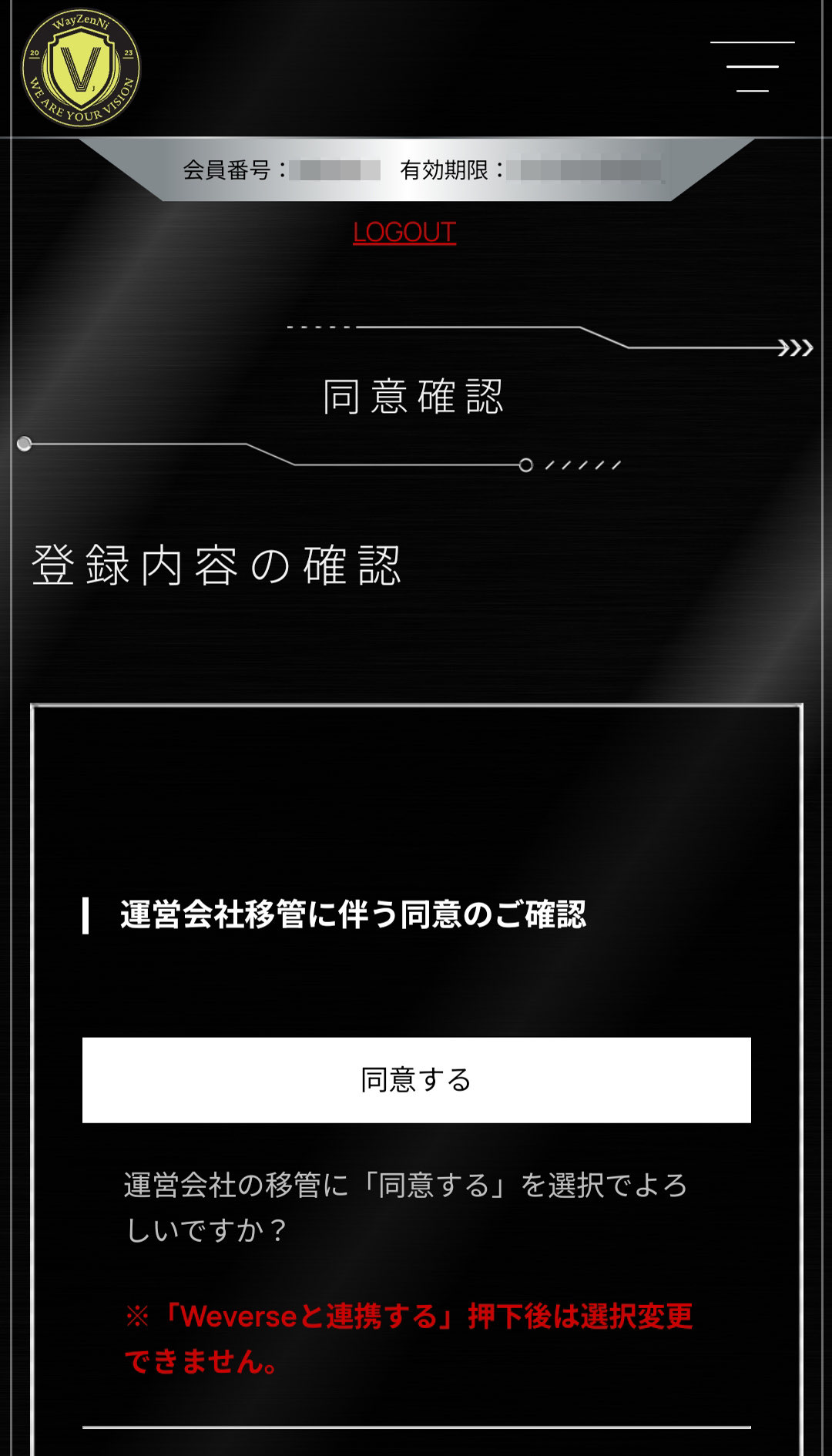 5.Weverseにログイン後、同意確認画面の各項目を確認・選択し、【同意する】を選択
